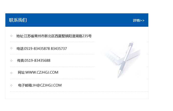 地址:常州市新北區友邦商務大廈1幢16、17層  電話:0519-85101652  傳真:0519-85112595  郵編:213022  網址:www.cz-jiayue_cn.bjhyyn.com  郵箱:xiajifengaa@163.com